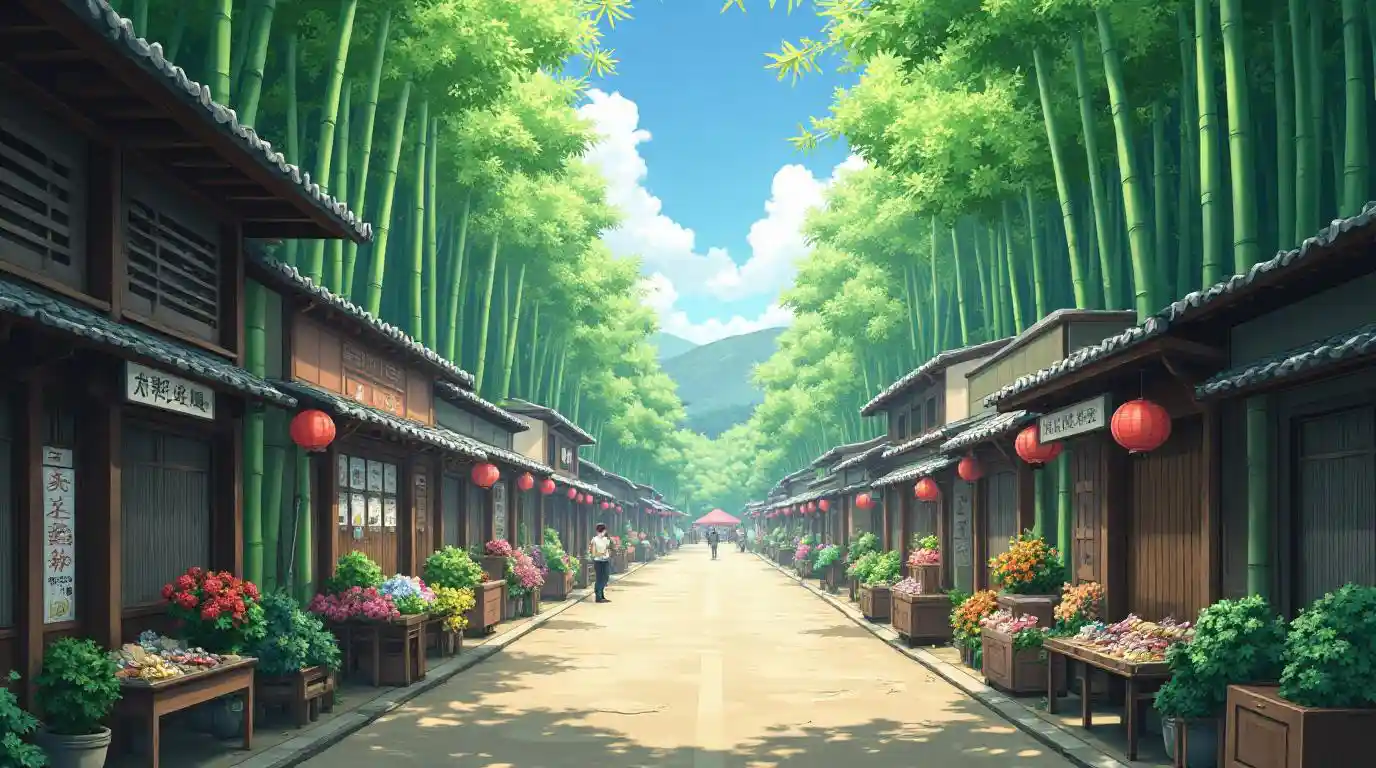 LaylaVibrant marketplace in the heart of a bamboo forest, influenced by traditional anime aesthetics.