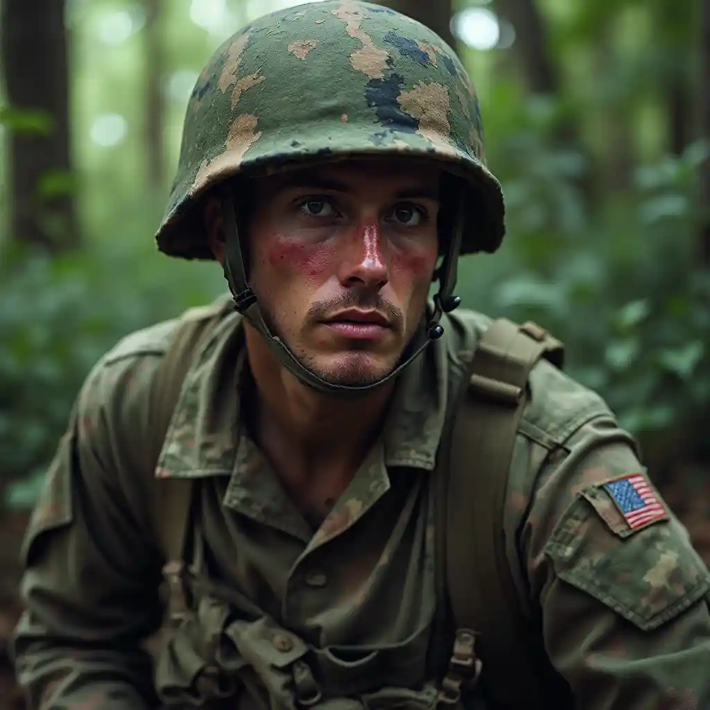 rubylynSoldado de EE. UU., Jungla, mirada fija, cansado, sangre.