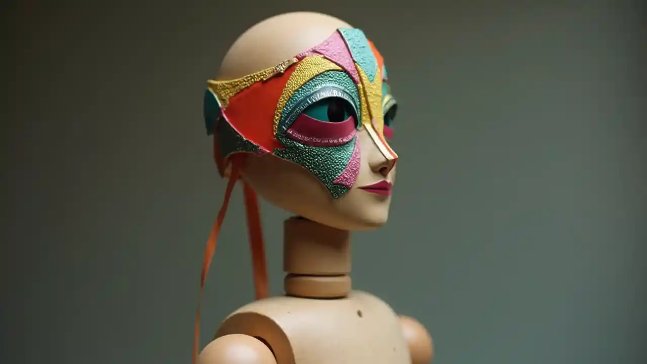 EmeryFotografía de estudio de un muñeco macho de madera, con una máscara colorida futurista, inspirada en el ballet triádico, estilo de la escuela bauhaus