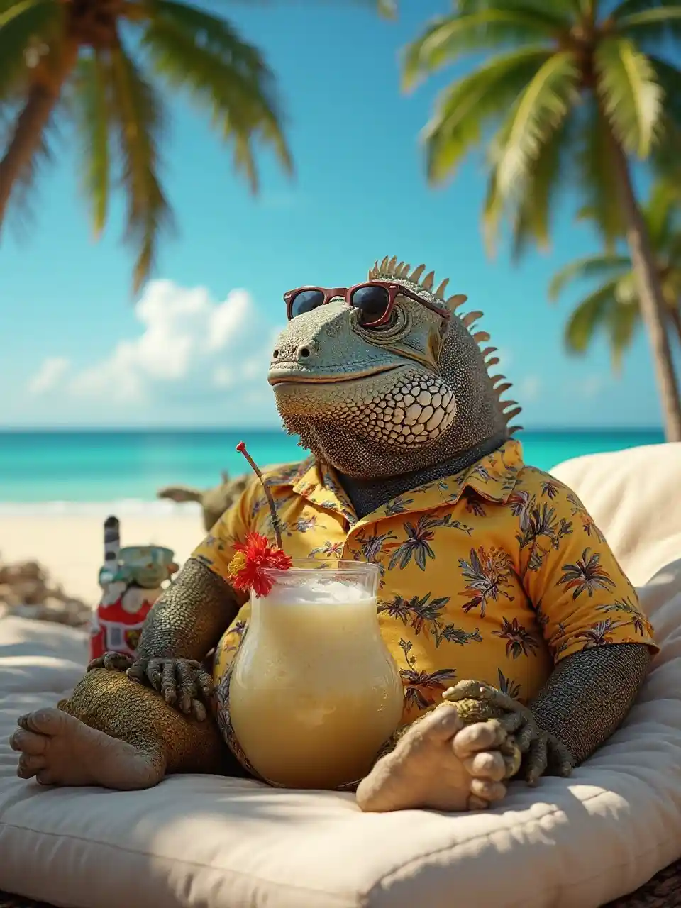 iguana gorda acostada en una tumbona en una playa caribeña con palmeras, con gafas de sol y una camisa hawaiana, sosteniendo una piña colada