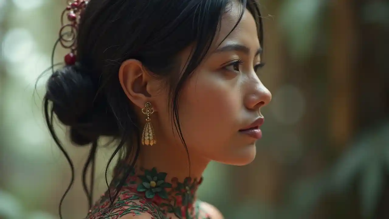 Retrato de perfil de una mujer tribal asiática de piel clara increíblemente hermosa, profundidad de campo, lente zeiss, detallada, simétrica, centrada, sesión de fotos de moda, por annie leibovitz y steve mccurry, david lazar, jimmy nelsson, impresionante, extremadamente detallado, hermoso, plano de establecimiento, artístico, hiperrealista, hermoso rostro, octanaje render, Fondo borroso