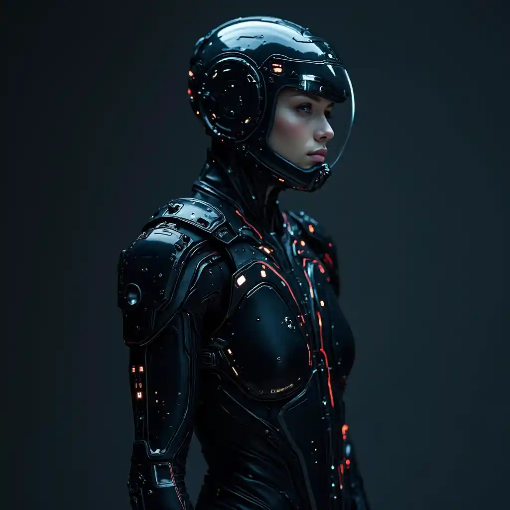 Crear una t-pose de un traje biomecánico en negro con detalles de color azul neón (o rojo alternativo), con áreas que se iluminan de acuerdo con la energía temporal. Casco retráctil, pero la mayoría de las veces la cara se destapa para humanizarlo. Ojos con un brillo sutil: uno es un implante que registra y analiza el flujo temporal. Cuerpo atlético, pero no exagerado; más parecido a un astronauta de élite que a un supersoldado