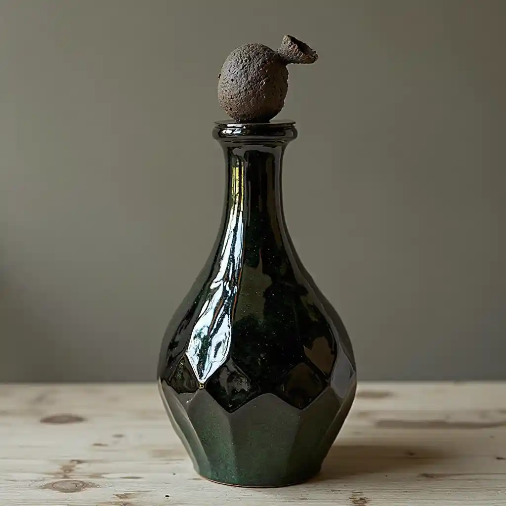 Asherbotella de tequila lujo de material cerámico negro con difuminado verde y ambar hexagonal y alta sin etiquetas, tapadera de con textura de basalto.