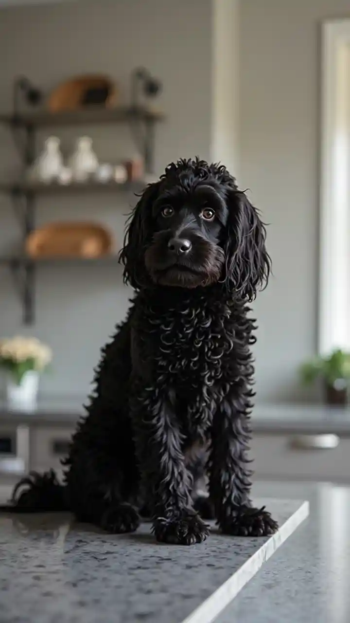 Jacksonperro cocker spaniel negro en la encimera gris de la cocina