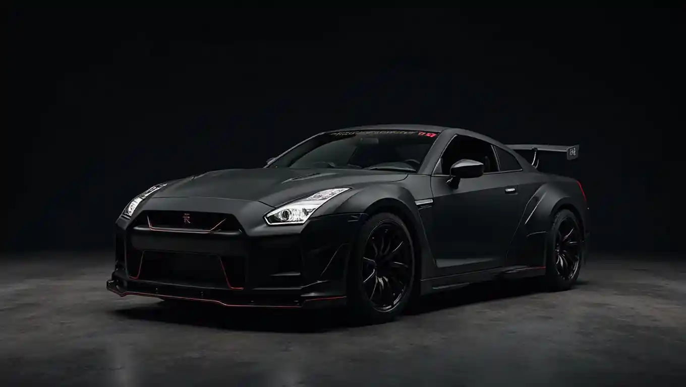 Negro Matte Spikey Nissan GT-R R34 en fondo oscuro