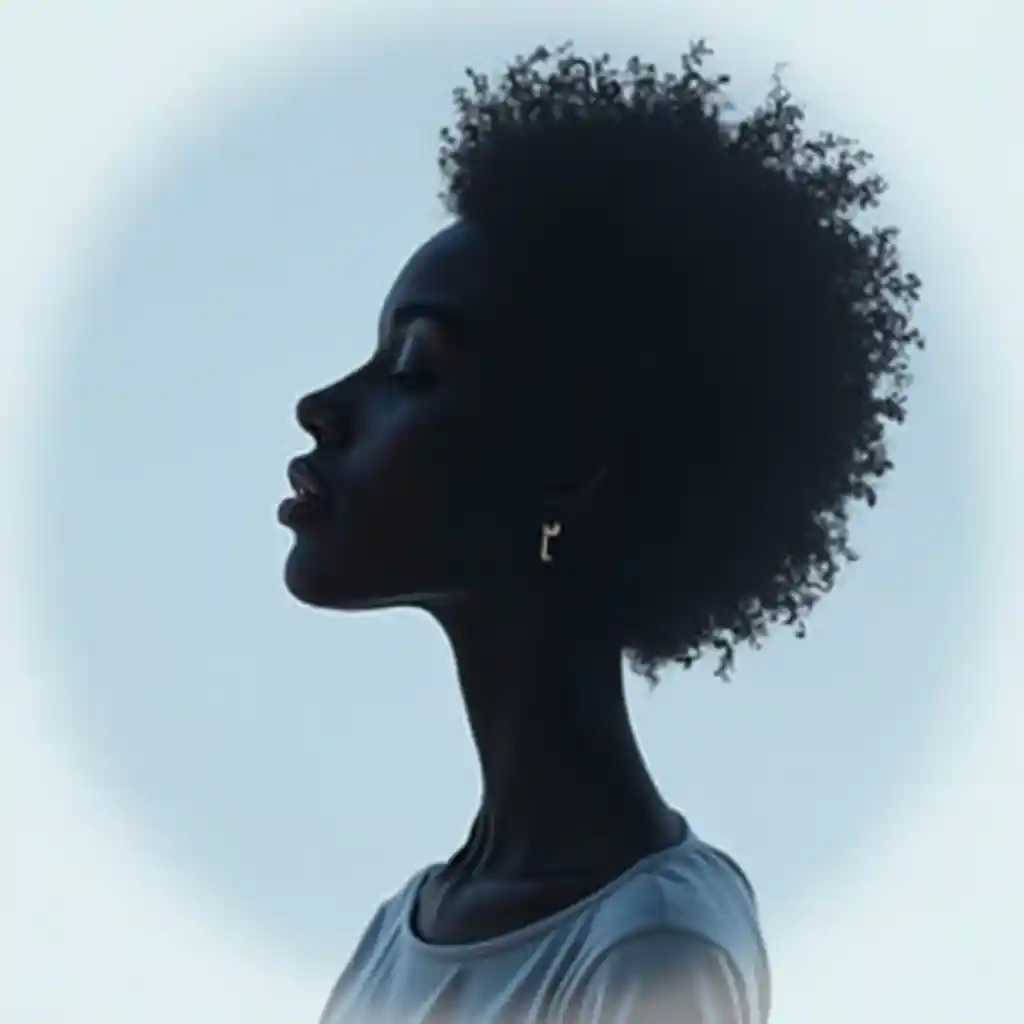 La silueta de una mujer negra en diseño minimalista, su perfil africano en peinado afro está grabado en suaves trazos azul cielo. El fondo gris claro la rodea como un cielo abierto, creando una sensación de inmensidad y calma. Su actitud pacífica se complementa con la simplicidad de los tonos. El diseño se siente sin esfuerzo pero profundo, estilo minimalista Mujeres negras Retrato Azul cielo y Gris claro, mujeres, cara linda, cuerpo perfecto, sonrisa perfecta