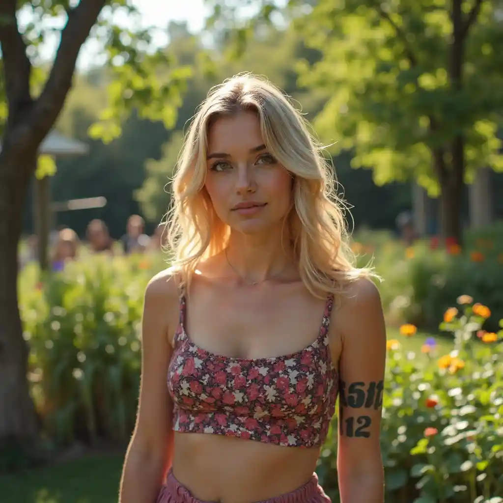 EvelynNiña rubia con un tatuaje de 1312 en el brazo izquierdo en Garden Picknick Witz
