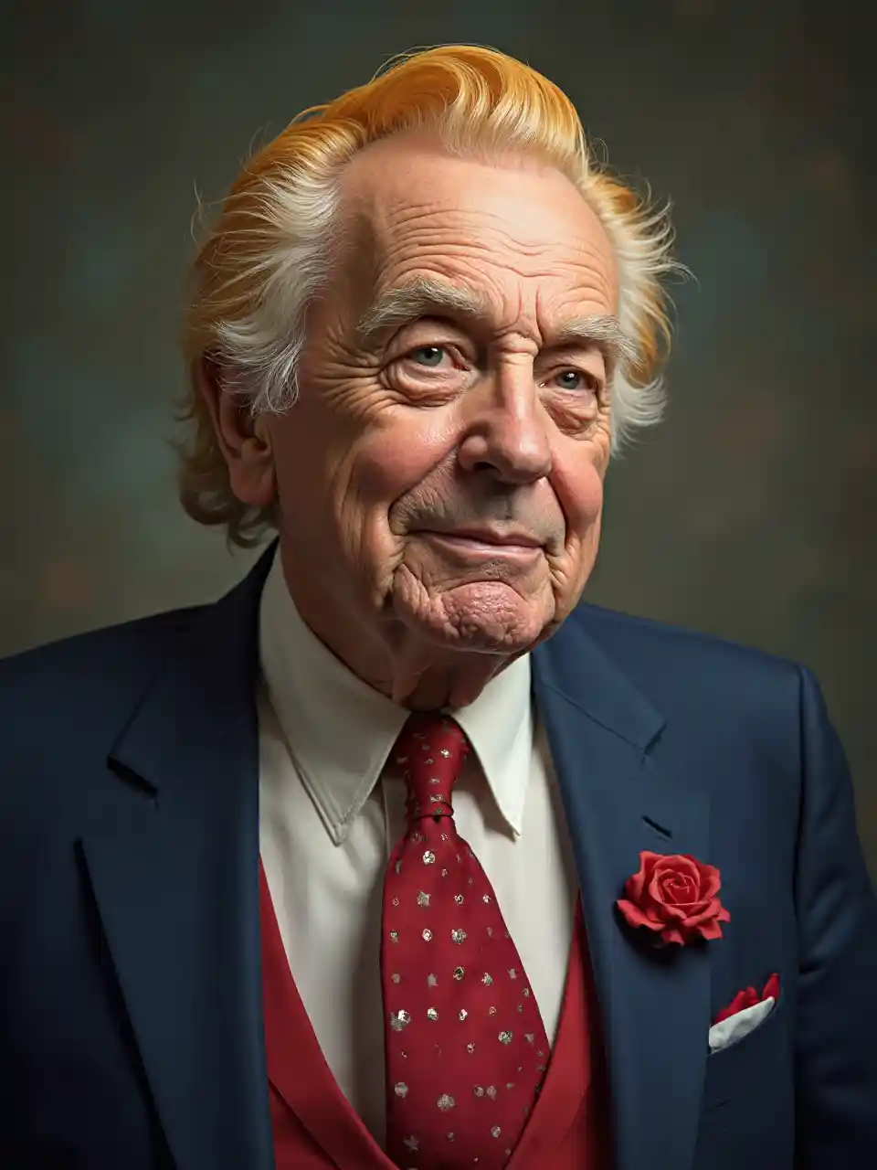 Anciano de pelo rubio y anaranjado con traje patriótico y corbata roja
