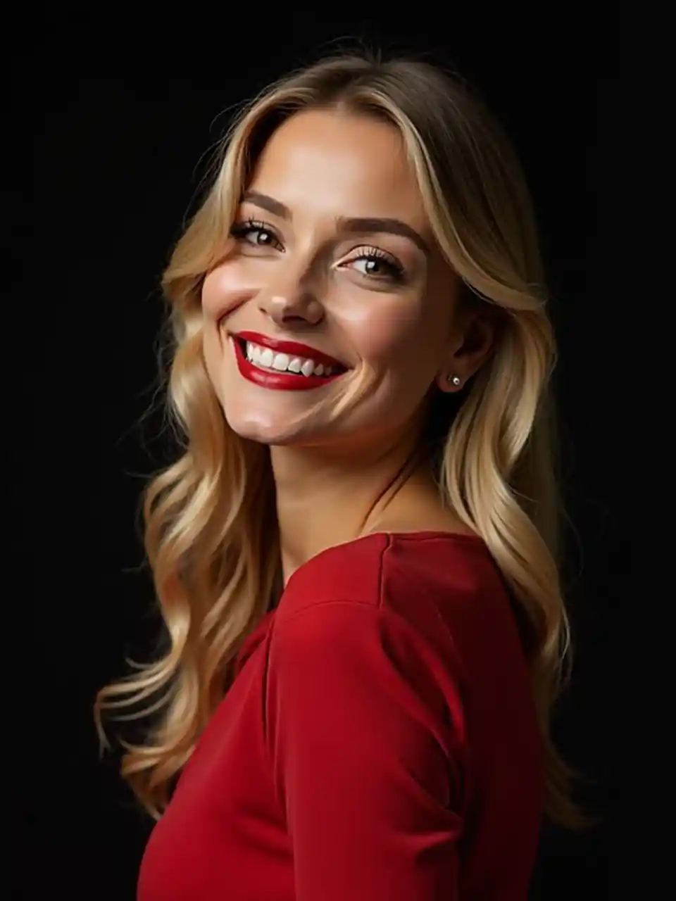 Leilahermosa rubia sonriente, sobre un fondo negro en un vestido rojo con lápiz labial rojo