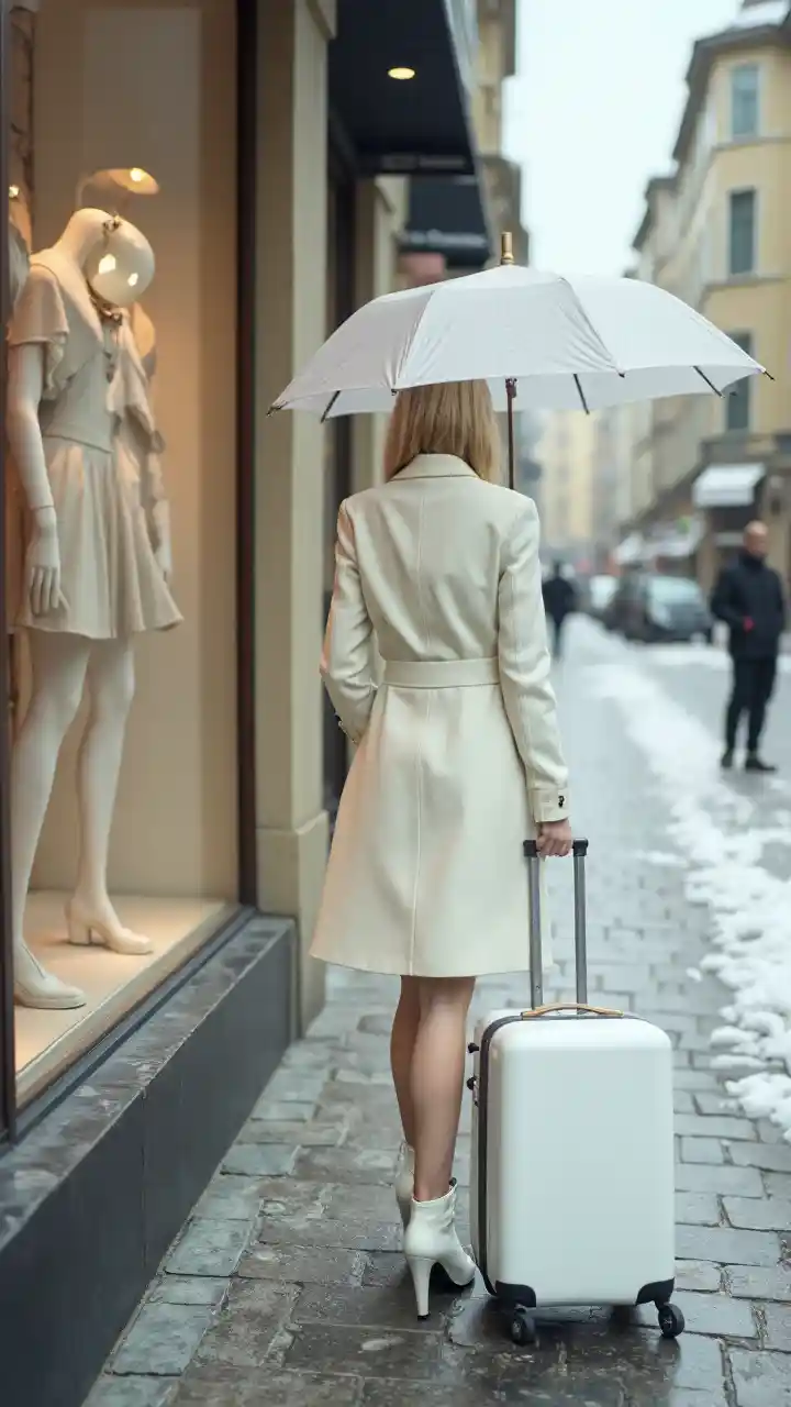 Vista completa de tres cuartos de una joven rubia con cabello corto que vestía un vestido blanco, un abrigo blanco, guantes blancos, un abrigo blanco, botas blancas en los tobillos, sosteniendo en su mano derecha un paraguas blanco abierto, sosteniendo una maleta blanca sobre ruedas que ella sostiene en su mano izquierda. La joven rubia está inmóvil frente al escaparate de una tienda de ropa en la acera de una calle empedrada muy estrecha y nevada. Le dan la espalda a los maniquíes que están parados en el escaparate de una tienda de ropa. El cielo está nublado.