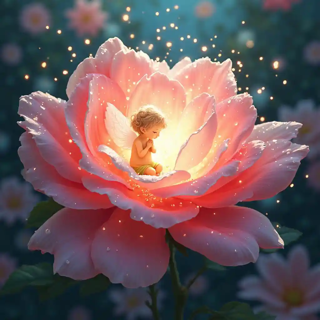 flor de rosa explota brillante destello de luz, dentro de la flor sentado pequeño ángel, ángel está rezando, gotas de rocío, brillan, brilla en gotas, brillan, anime