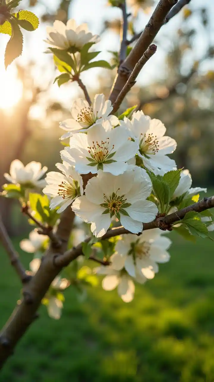 Manzano de primavera en flor con sol matutino
