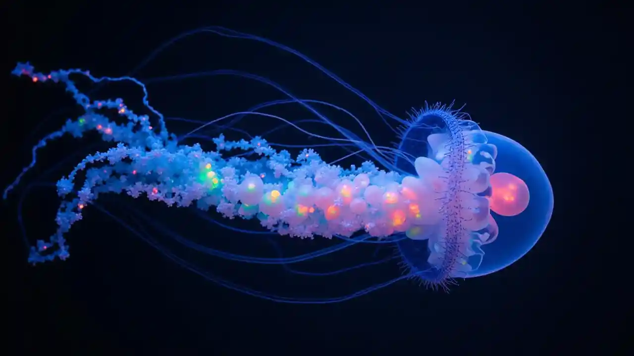Una medusa bioluminiscente muy larga con un fondo oscuro. Colores azul amarillo y rosa