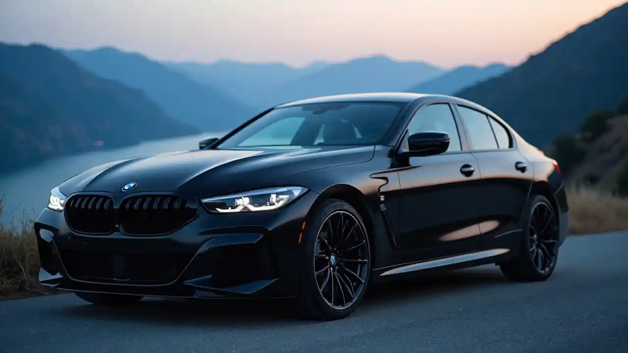 Un hermoso BMW Sedán negro parado en la carretera de montaña, muy detallado por la noche, Car Bonnet Stripes Graphics Hood, mar azul en el fondo del automóvil, automóvil muy detallado, faros muy detallados y DRL blancos, color de acabado mate muy detallado, llantas de aleación muy detalladas, ultra realista, fotorrealista, 32k.