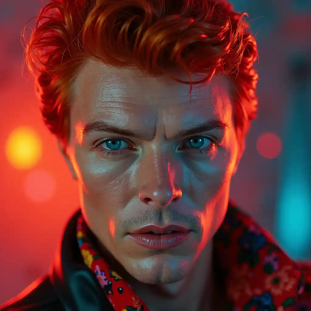 Retrato de David Bowie, colores brillantes y saturados, elegante, altamente detallado, moda, revista de moda, enfoque nítido, maquillaje expresivo brillante, iluminación dramática, profundidad de campo, fondo increíblemente detallado y borroso