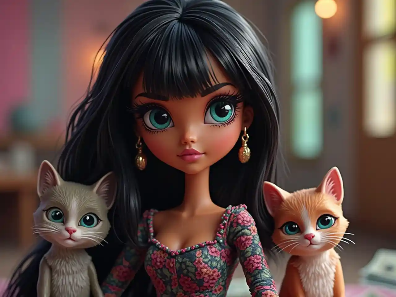 Paisleymuñeca bratz realista con pelo negro de longitud media y flequillo, con gatos realistas de su lado y dinero en todas partes