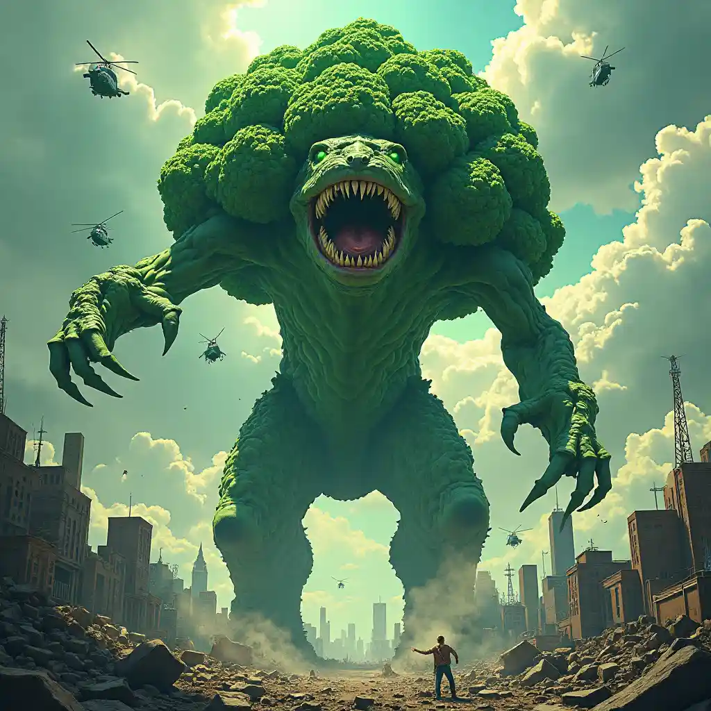 Un colosal e hiperdetallado tallo de brócoli se eleva sobre un paisaje urbano devastado, ahora se convirtió en una aterradora bestia kaiju con grotescas características humanoides. Su corona floreada se cierne como una nube de hongo verde palpitante, pero brotando del tallo hay una cara monstruosa: retorcida, gruñendo y llena de dientes irregulares como de corteza. Ojos verdes huecos y brillantes resplandecen con rabia radiactiva debajo de una frente frondosa y espesa, y una larga lengua parecida a una vid arremete entre la carne de flor quebrada. El tallo del brócoli es nudoso y musculoso como la madera envuelta en músculos, y sobresalen de sus lados dos diminutos brazos patéticos tipo T. rex: cortos, gruesos y con garras, que terminan en tres dedos de garra dentados hechos de corteza astillada y raíz retorcida. Atraviesa la ciudad, los edificios se desmoronan bajo las patas de los troncos de los árboles, sus rugidos resuenan como troncos de madera y truenos. Civiles gritando se dispersan debajo mientras los helicópteros dan vueltas, impotentes. La radiación verde neón se filtra por fisuras en sus extremidades. Los kanji de anime llameantes gritan su nombre a través del cielo. Estilo: horror anime-kaiju apocalíptico con líneas gráficas de manga, desenfoque de movimiento cinematográfico, iluminación radiactiva, texturas arenosas, sombras dramáticas y destrucción explosiva. Paleta: grises ahumados, naranjas quemadas y verdes nucleares.