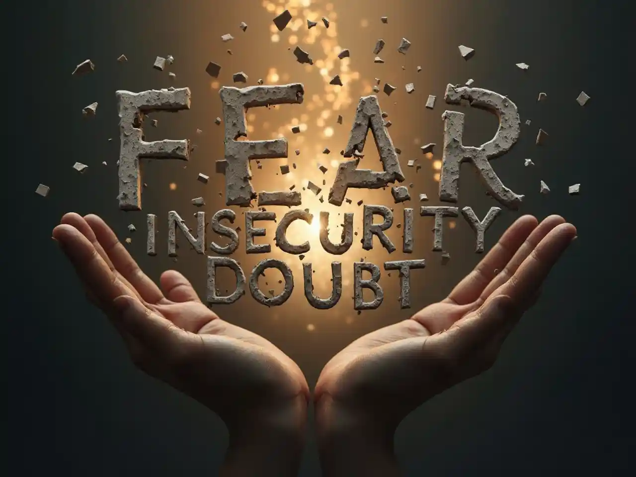 Manos humanas levantadas sosteniendo cadenas de metal rotas, fragmentos vuelan de las cadenas que forman las palabras miedo, inseguridad y duda en una tipografía gris y audaz agrietada, luz dorada que viene de atrás, estilo fotorrealista, atmósfera dramática.