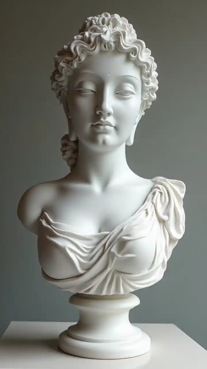 Fotografía hiperrealista: un prístino busto de Buda, que recuerda a las antiguas esculturas griegas, se alza majestuosamente sobre un fondo apagado. El busto de mármol captura la belleza etérea de la diosa, con detalles intrincados que muestran sus características perfectamente simétricas, delicadas clavículas y cabello ondulado en cascada. La escultura emana un aura de elegancia divina y belleza atemporal. La iluminación es suave y direccional, proyectando sombras suaves que acentúan la profundidad y los detalles de la escultura. Configuración de la cámara para la toma: Sony A7R IV, lente de 85 mm, f/2.0, ISO 100, con una luz lateral suave para enfatizar los contornos de la escultura. --ar 4:5 --v 5 --q 2.