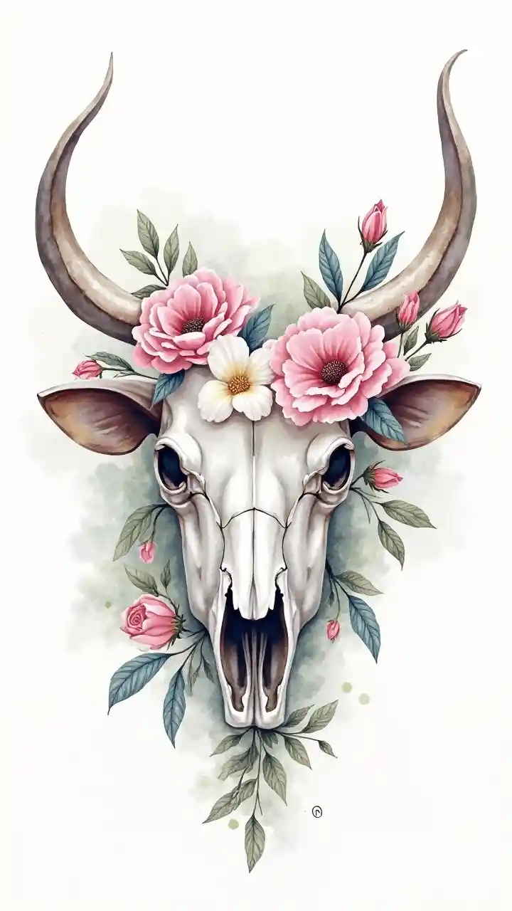 EthanCalavera de toro con flores y plumas acuarela sin fondo
