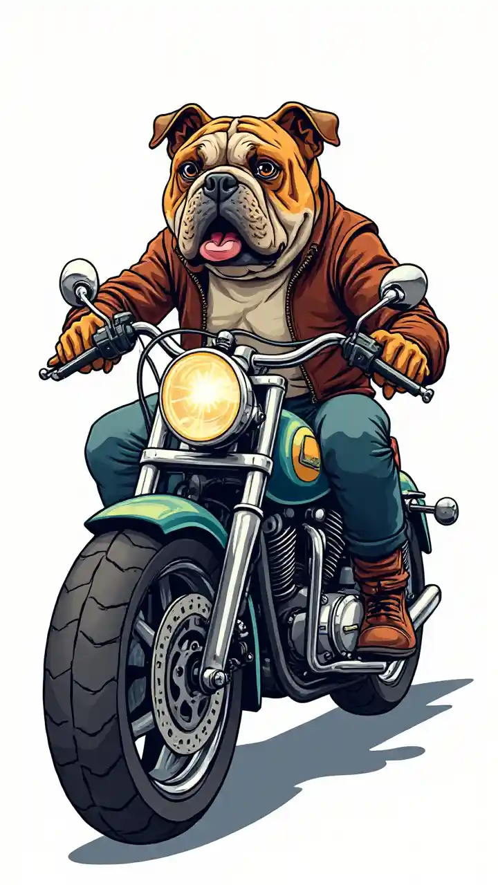 un bulldog montando una motocicleta, al estilo del arte cómico vectorial sobre fondo blanco