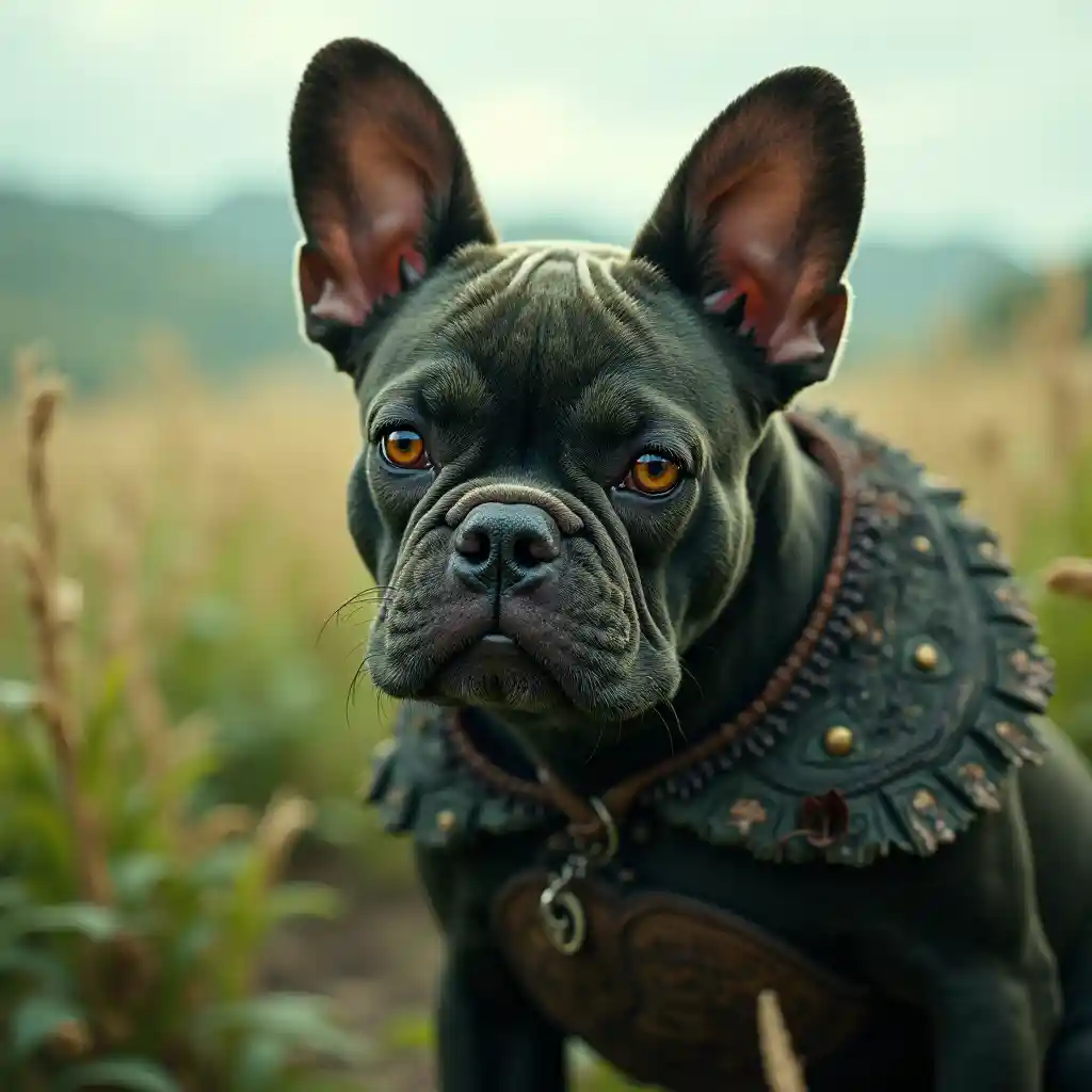color, 8k, 4k, alta resolución, hermoso guerrero vikingo verde bulldog francés en un campo, arte digital, detalles atractivos, hermosos e intrincados, rostro detallado, ojos cerrados hiperdetallados, máscara de ojo zorro, estación de arte, luz ambiental