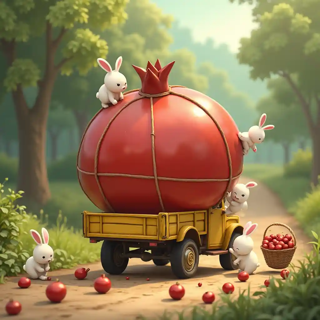Una escena surrealista y caprichosa en la que una granada roja colosal, atada con gruesas cuerdas marrones, es cargada en un pequeño camión amarillo vintage con paneles laterales de madera por varios conejitos blancos chibi con ojos grandes y expresivos. Un conejito chibi está parado en la caja del camión, aparentemente tratando de asegurar la fruta gigante con cuerdas diminutas. Otro conejito chibi está parado en el camino de tierra, alcanzando la plataforma del camión para ayudar. Un tercer conejito chibi está subiendo al costado del camión. Un cuarto conejito chibi se aleja del camión por el camino de tierra, llevando una canasta tejida rebosante de granadas rojas más pequeñas. El entorno parece ser un camino de tierra o un camino que serpentea a través de un exuberante entorno verde con árboles y follaje en un enfoque suave en el fondo. Dispersas en el suelo alrededor del camión y los conejitos son muchas granadas rojas más pequeñas. La iluminación debe ser suave, luz natural, posiblemente filtrada a través de los árboles, proyectando sombras suaves y difusas. Los reflejos cálidos sutiles deben ser visibles en las superficies redondeadas de las granadas y el camión. El tono visual general debe ser encantador, caprichoso y ligeramente fantástico debido al enorme tamaño de la fruta y los pequeños conejitos chibi que trabajan juntos.