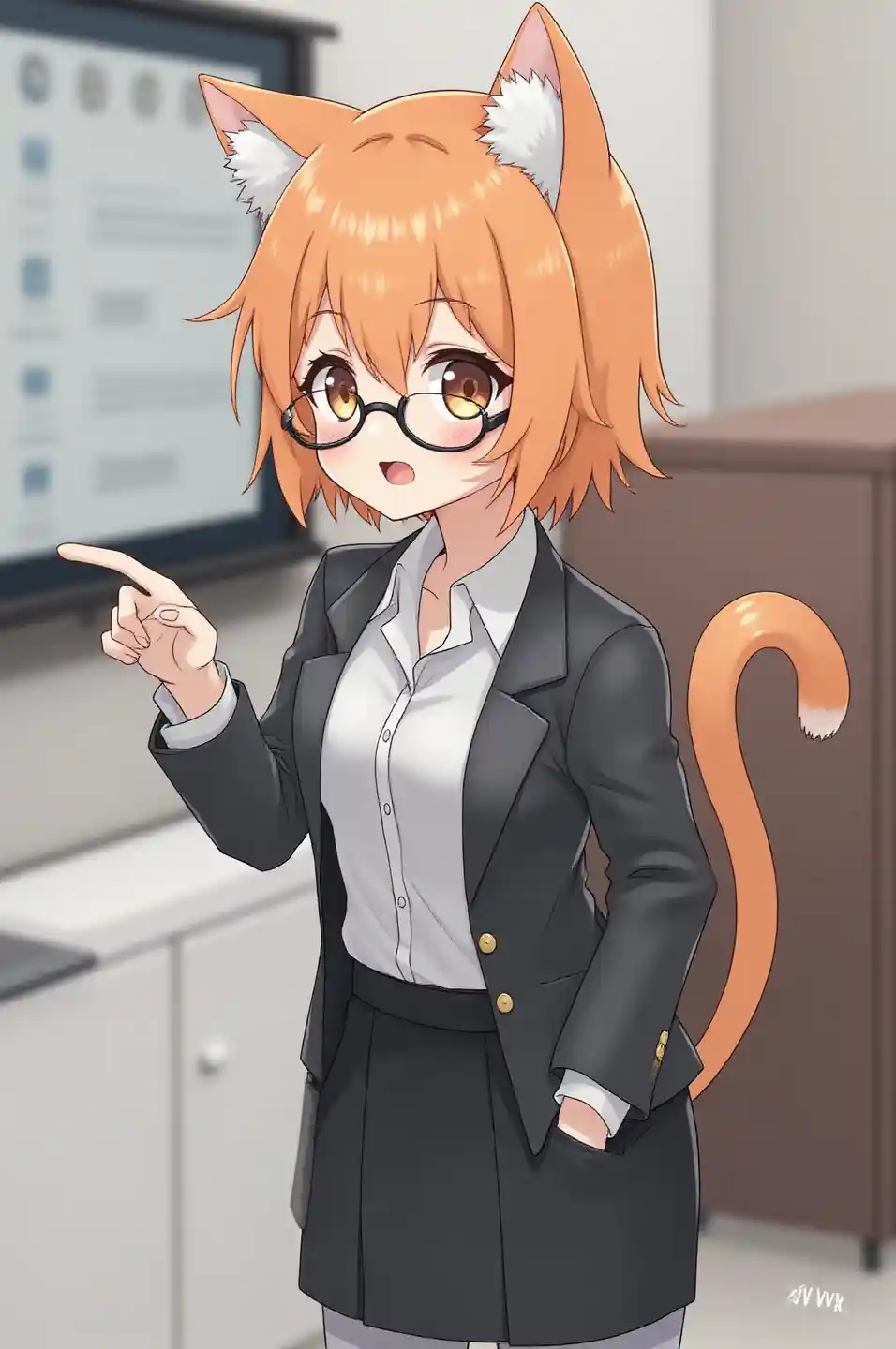 pelo anaranjado, ojos anaranjados, catgirl, orejas de gato, cola de gato, usa anteojos, atuendo casual de negocios, se para frente a una pantalla que muestra una presentación, da un presen