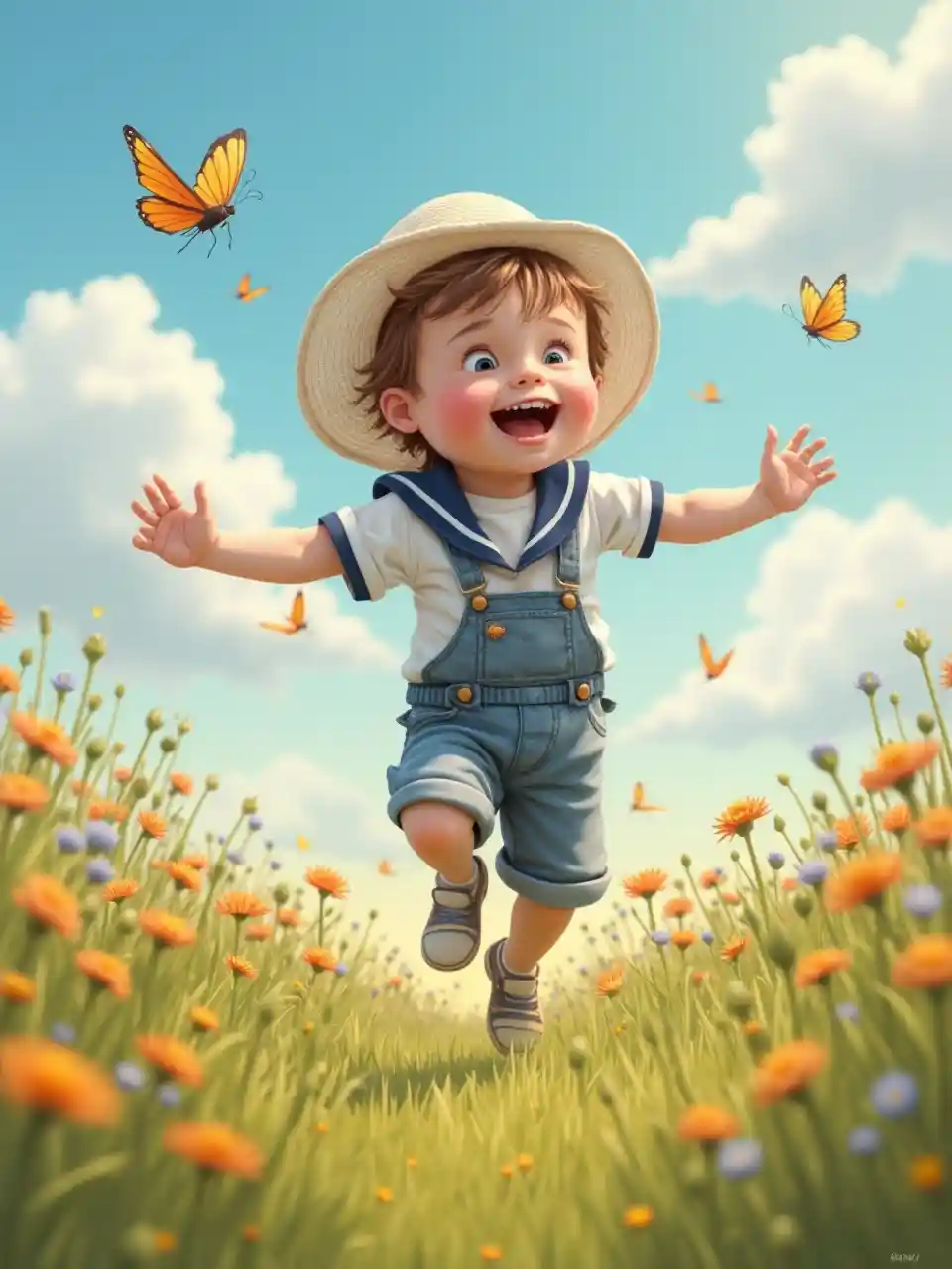 Persiguiendo mariposas en un prado soleado, un niño blanco de 5 años con cabello desordenado usa un traje de marinero y un sombrero de red. Las flores silvestres y las nubes esponjosas lo enmarcan, sus ansiosos saltos irradian inocencia y alegría despreocupada en un entorno brillante y natural.