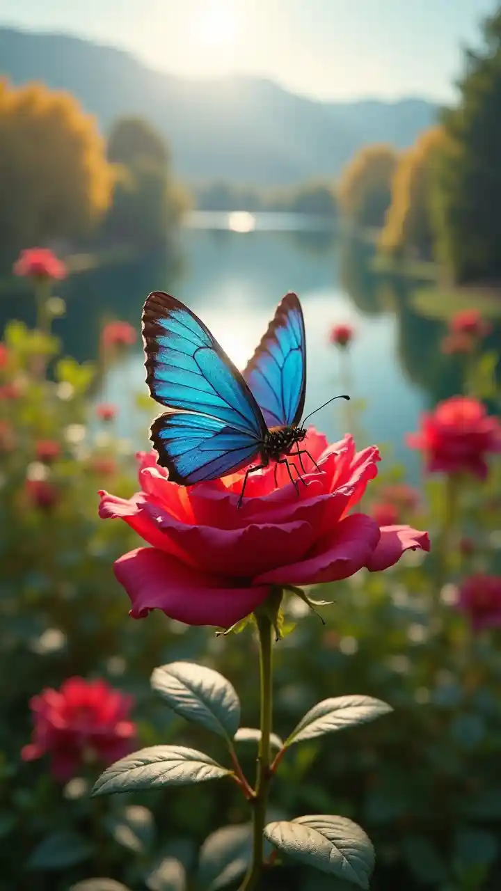 en un jardín con iluminación suave con un rayo de sol sobre una mariposa azul topacio se sienta sobre una rosa roja rubí con un lago en el fondo en vista panorámica y un ángulo holandés