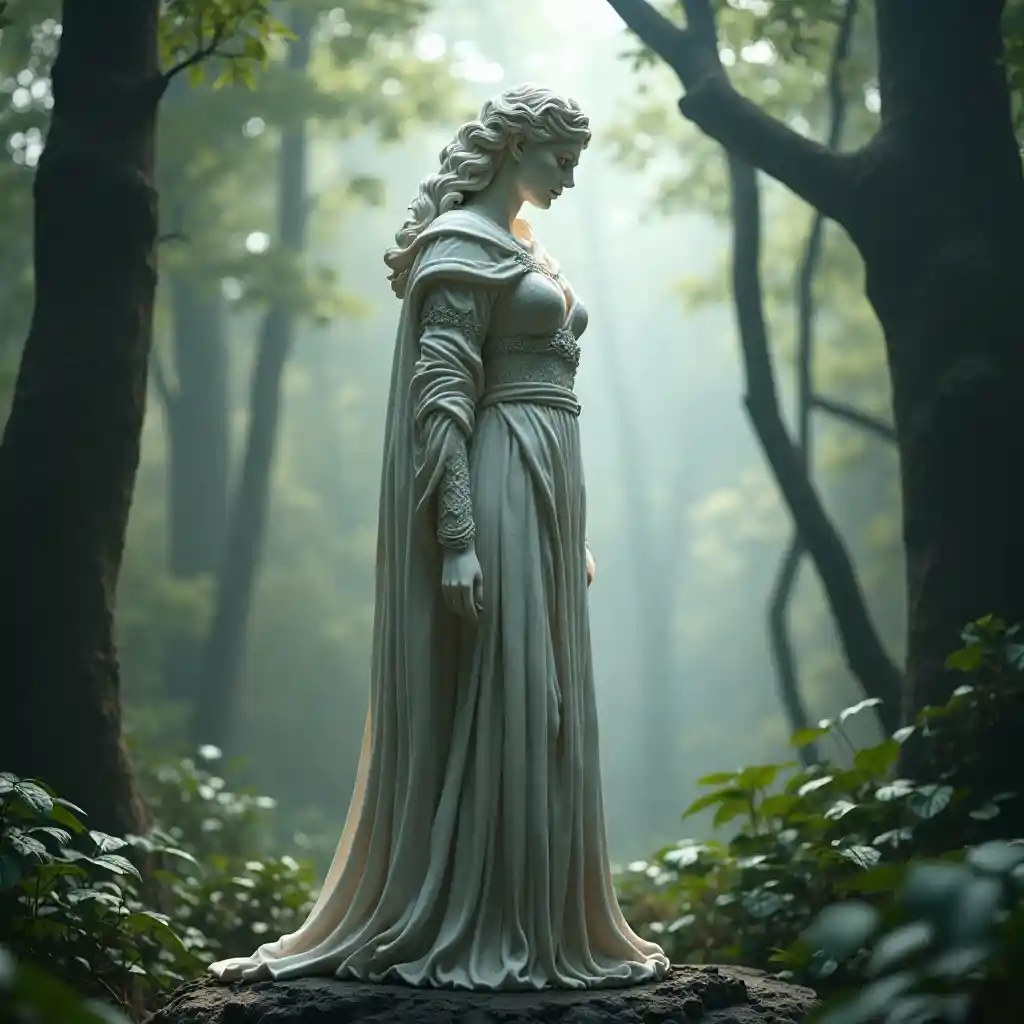 Impresionante estatua de mármol de Calacatta en un bosque etéreo