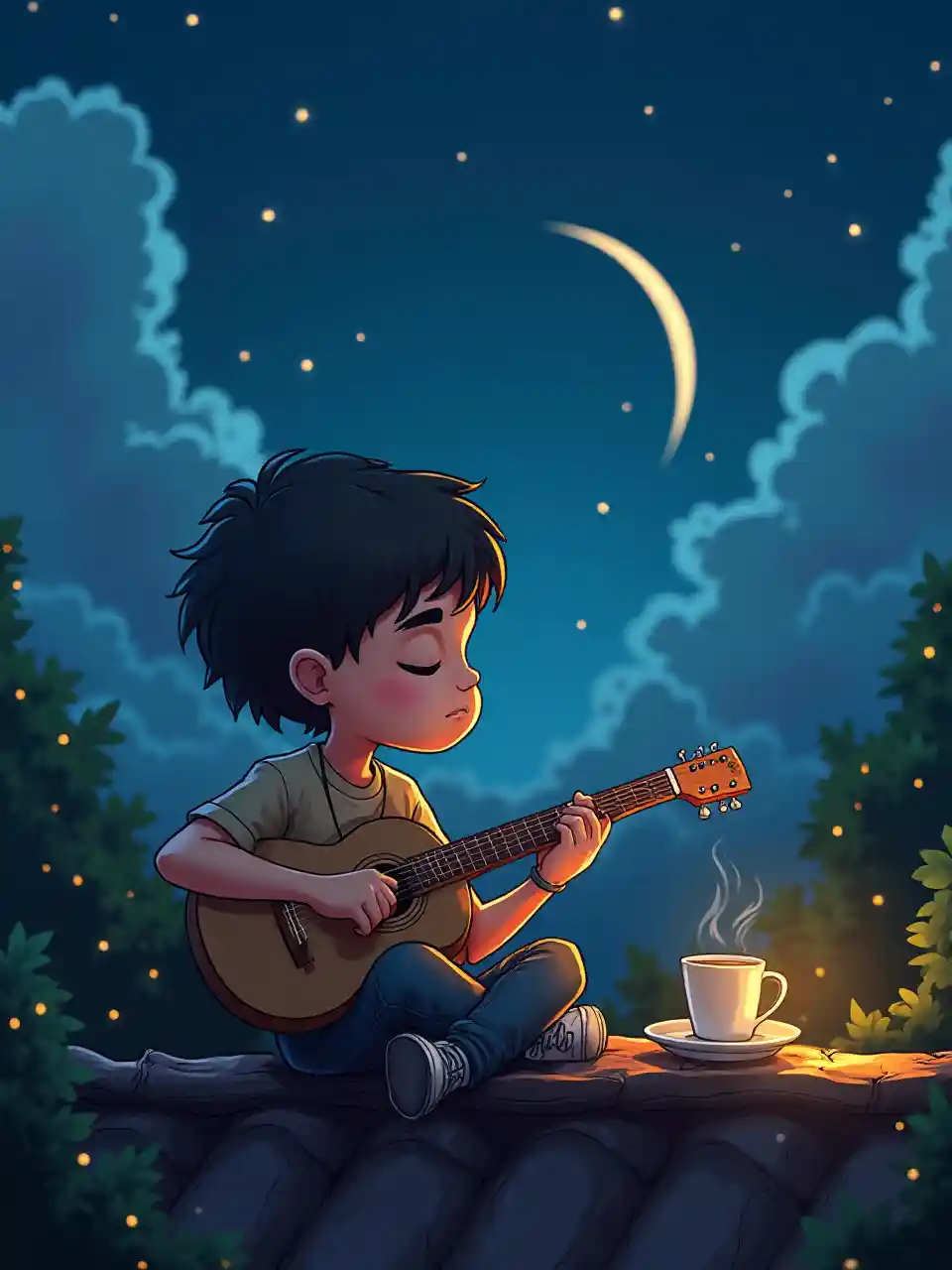 Un niño de dibujos animados tocando la guitarra bajo el cielo nocturno