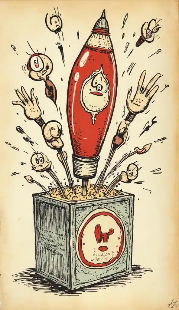Libro de recortes de dibujos animados que explota: ojos al estilo Looney Tunes que sobresalen de los cuadros médicos antiguos, botella de ketchup como cohete, manos dibujadas en tinta que sobresalen de una caja de cereal