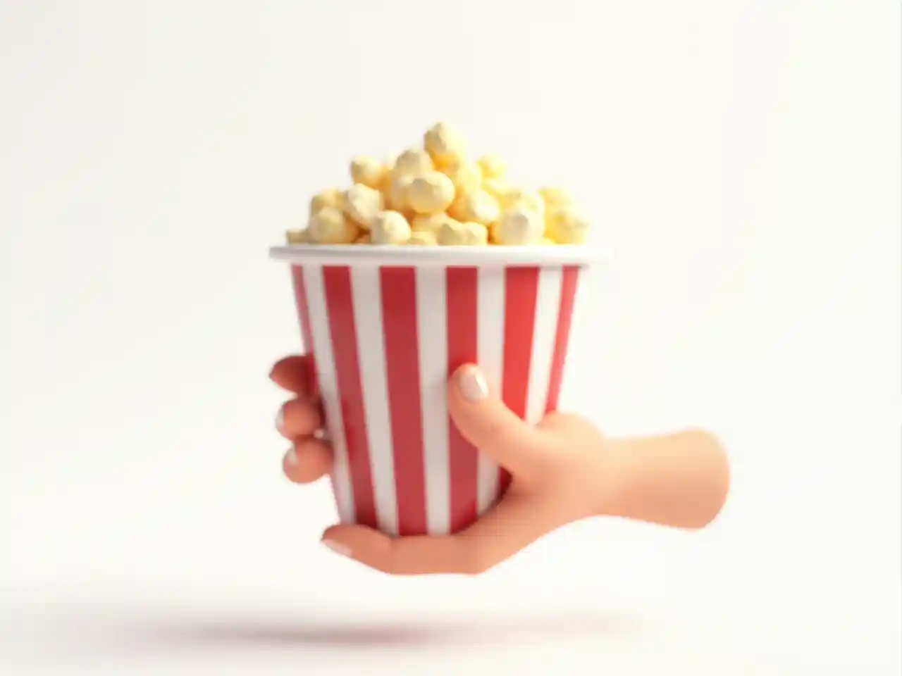 Una mano de dibujos animados sostiene una taza de palomitas de maíz, dibujos animados, renderizado en 3D, luz suave, fondo blanco