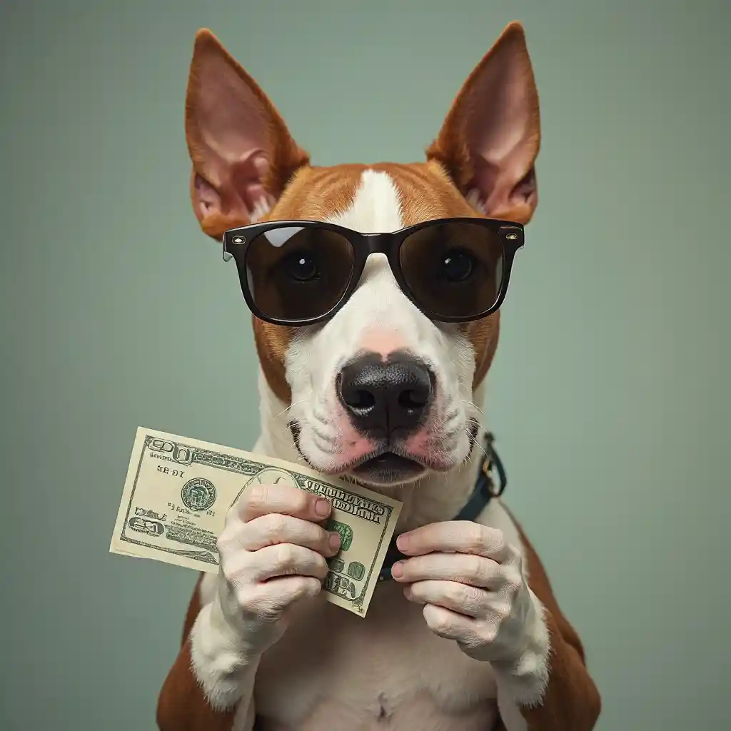 GisellePor favor, genere un bull terrier con gafas de sol que cuente dinero en efectivo.