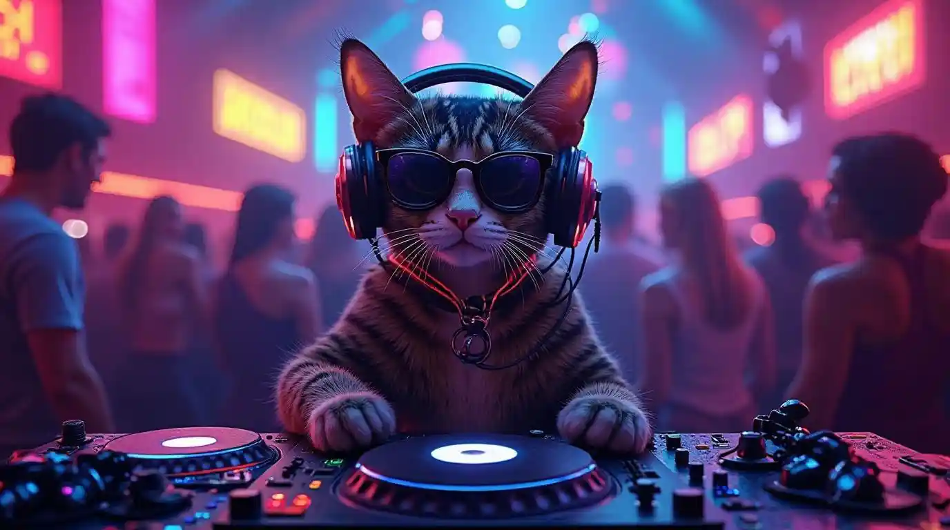 Un genial DJ de gatos en un vibrante club nocturno, rodeado de luces de colores y una pista de baile llena de asistentes a la fiesta. El gato, con elegantes auriculares y gafas de sol, se mezcla en un tocadiscos con una pose segura. El ambiente es enérgico y animado, con letreros de neón parpadeando en el fondo, creando una sensación de diversión y emoción. La paleta de colores es una mezcla de azules profundos, morados y amarillos brillantes, lo que mejora el ambiente de la vida nocturna.