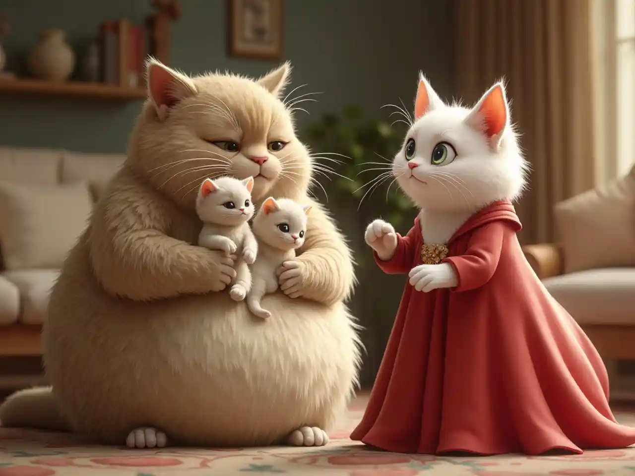 Crea una imagen de un gato gordo y gordito sosteniendo a su pequeño gatito en sus brazos, mostrando su rostro una mezcla de frustración y afecto mientras discute con un hermoso gato blanco. El gato regordete debe tener un cuerpo suave y redondo, con pelaje esponjoso y una expresión entrañable y ligeramente gruñona mientras sostiene al gatito suavemente pero con protección. El gatito, pequeño y con los ojos muy abiertos, se aferra al pelaje del gato regordete, observando la interacción con curiosidad inocente. Frente a él se encuentra un elegante gato blanco, elegantemente vestido con un vestido rojo suelto, con rasgos refinados y una postura equilibrada. Su expresión es a la vez severa y elegante, como si estuviera haciendo su punto con calma, con una pata delicadamente levantada mientras gesticula. El fondo podría ser un entorno doméstico acogedor, tal vez una sala de estar cálidamente iluminada con muebles suaves, para enfatizar el contraste humorístico entre sus personalidades. La escena captura una encantadora mezcla de dinámicas familiares, ya que el gato gordito y el elegante gato blanco entablan una discusión alegre, con el gatito atrapado adorablemente en el medio.
