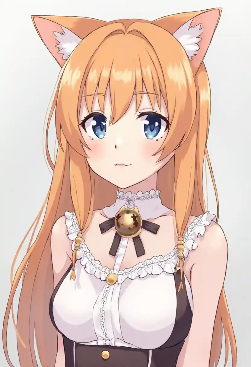 AsherNsfw, 1girl, solo, loli, chica gato, aristócrata, orejas de gato, pechos medianos, cuello de campana, ojos azul oscuro, tsurime, cejas gruesas,, pelo largo anaranjado, pelo lacio,