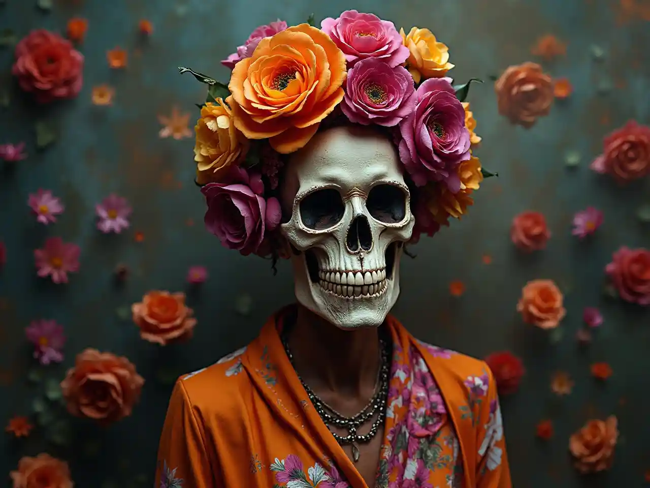 MadelynComposición similar, color similar, catrina, día de la muerte, flores, colores púrpura y naranja Gamma, 8k, realista, vida real, acción en vivo, imagen similar