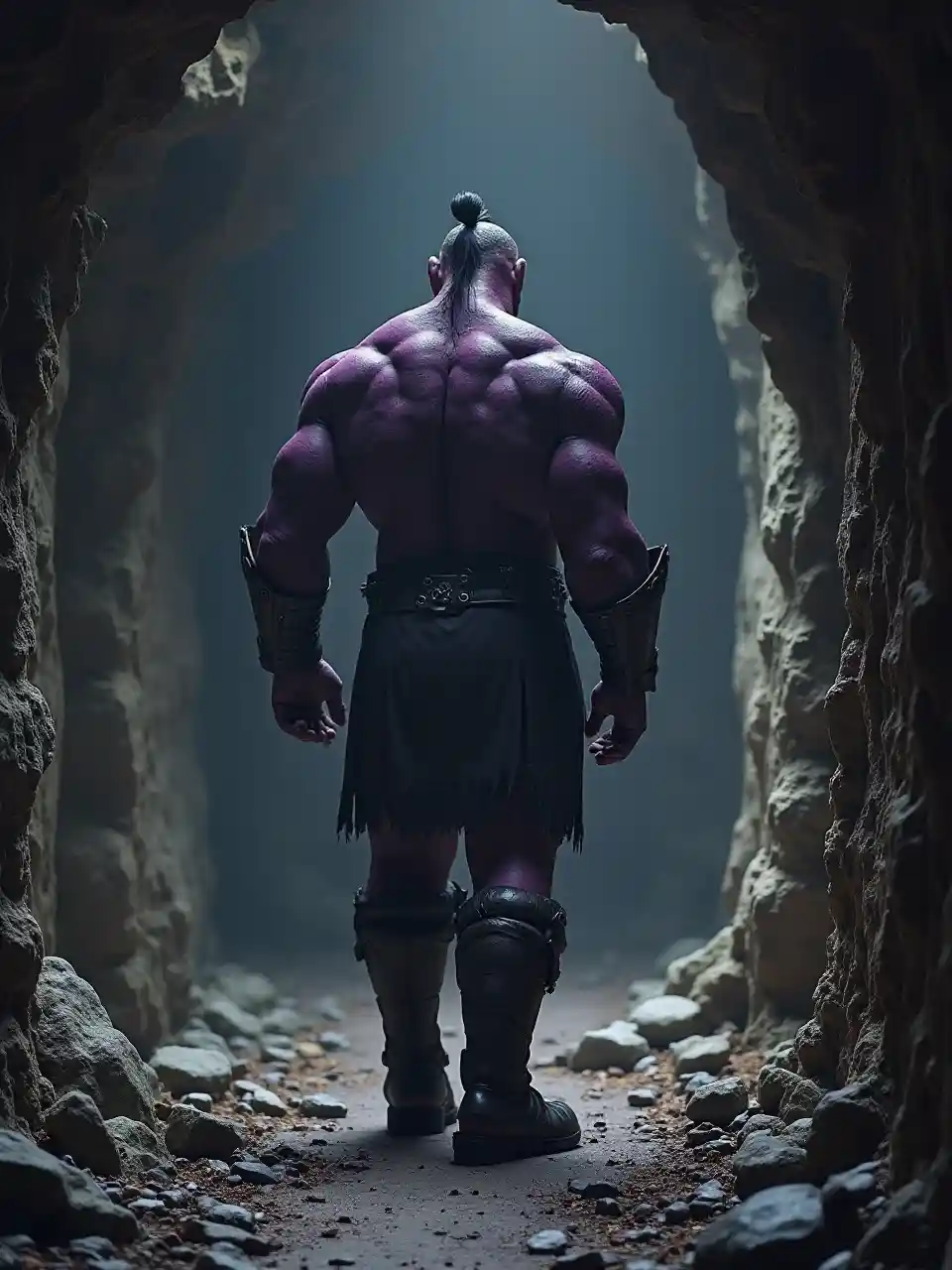 cueva antigua, oscura, atenuada, sala, habitación, enorme piel musculosa de color púrpura, ((negrita)), ((cara viciosa)), (armadura)), (cola de caballo), de pie, (vista desde atrás), (alejándose))