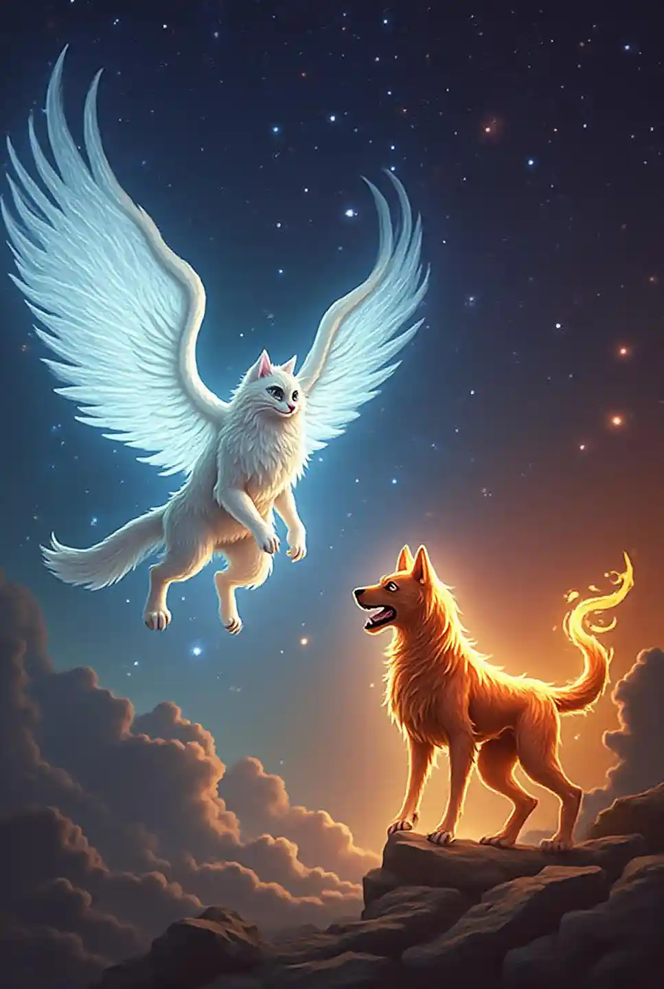 HarrisonUna batalla cósmica entre dos monstruos celestiales colosales: un gato alado divino con pelaje como galaxias arremolinadas y un perro de caza fantasmal ardiente en crepitantes luces