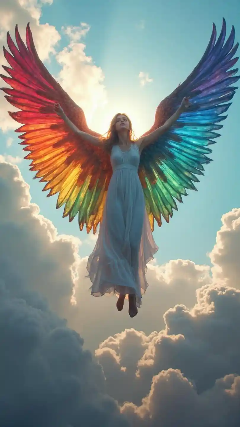 Ser brillante con alas de arco iris flotando como un dios