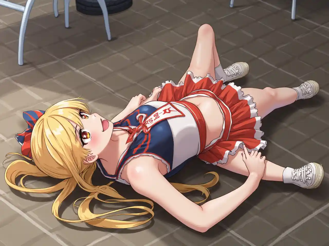 NSFW, (adolescente muy joven), (rubia), (animadora), niña en la escuela, ((acostada boca arriba), (abriendo las piernas), (extendiendo las piernas), la boca abierta, los ojos mirando hacia arriba ligeramente, (sacando la lengua), muchos detalles, sexy, (falda: 1.2) levantada, revelándola (coño perfecto)