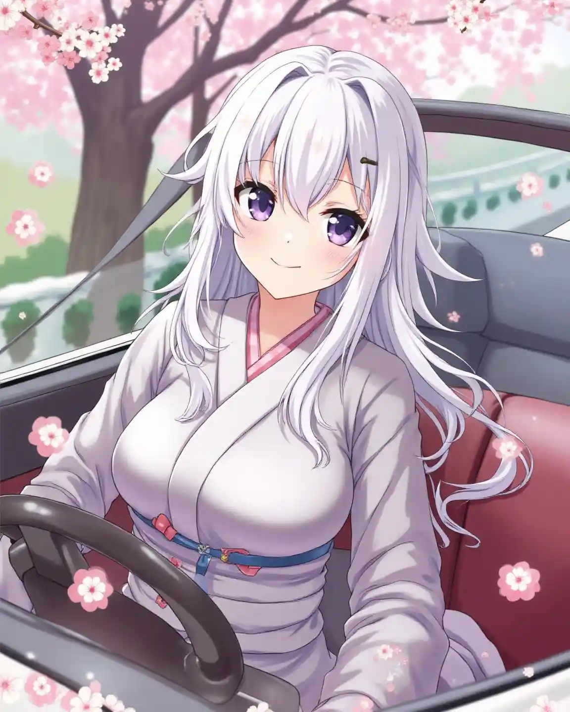 WyattMujer 1, mujeres hermosas en autos, cabello largo y blanco, ojos morados, hermoso kimono, flores de cerezo, alta resolución, obra maestra, flores de cerezo