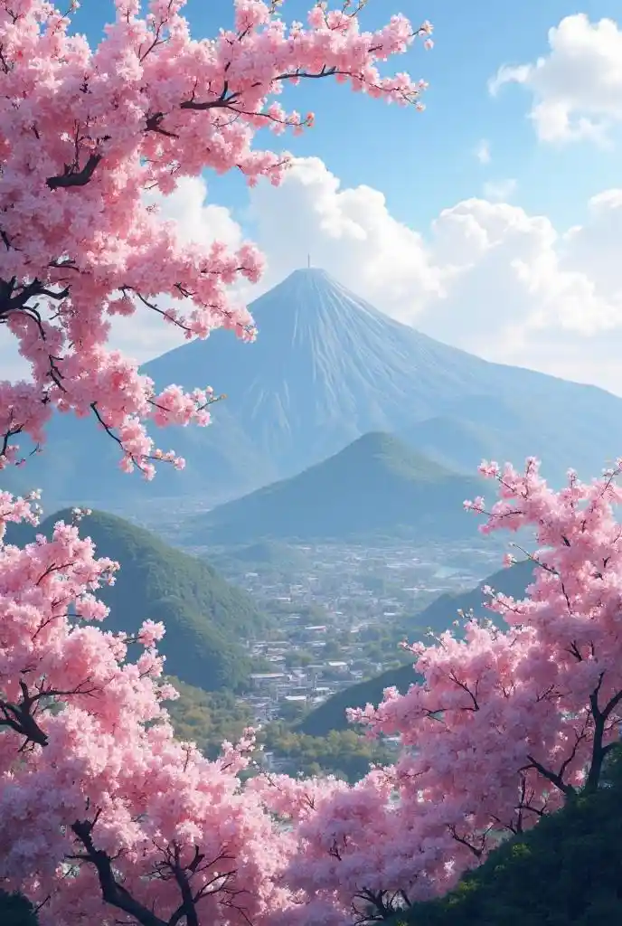 obra maestra, de la más alta calidad, alta resolución, 8k, (realista, fotorrealista: 1.3), flores de cerezo, hasta donde puedo ver montañas y pueblos, nubes borrosas