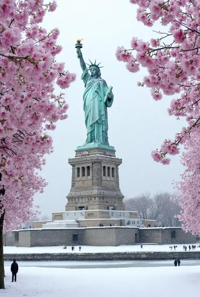 Cerezos en flor en la Estatua de la Libertad en Francia