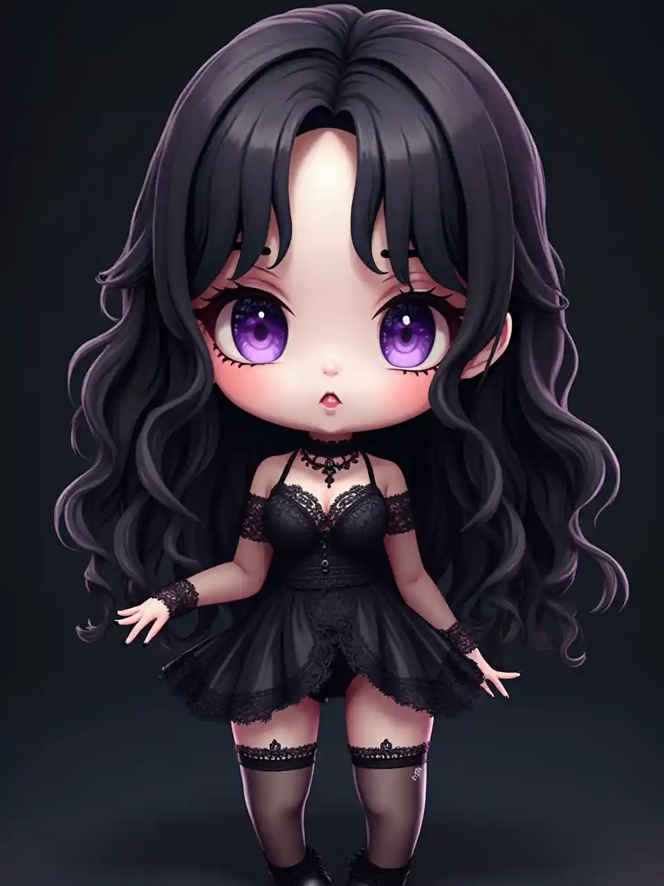 chibi. 3D. Cabello negro ondulado. Traje de encaje negro. Ojos morados. Piel pálida. Uñas largas y negras. Calidad 4K. Fondo oscuro.