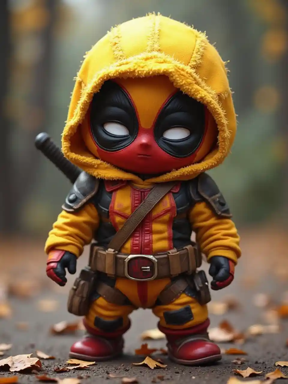 Un lindo pollito amarillo bebé vestido como Deadpool