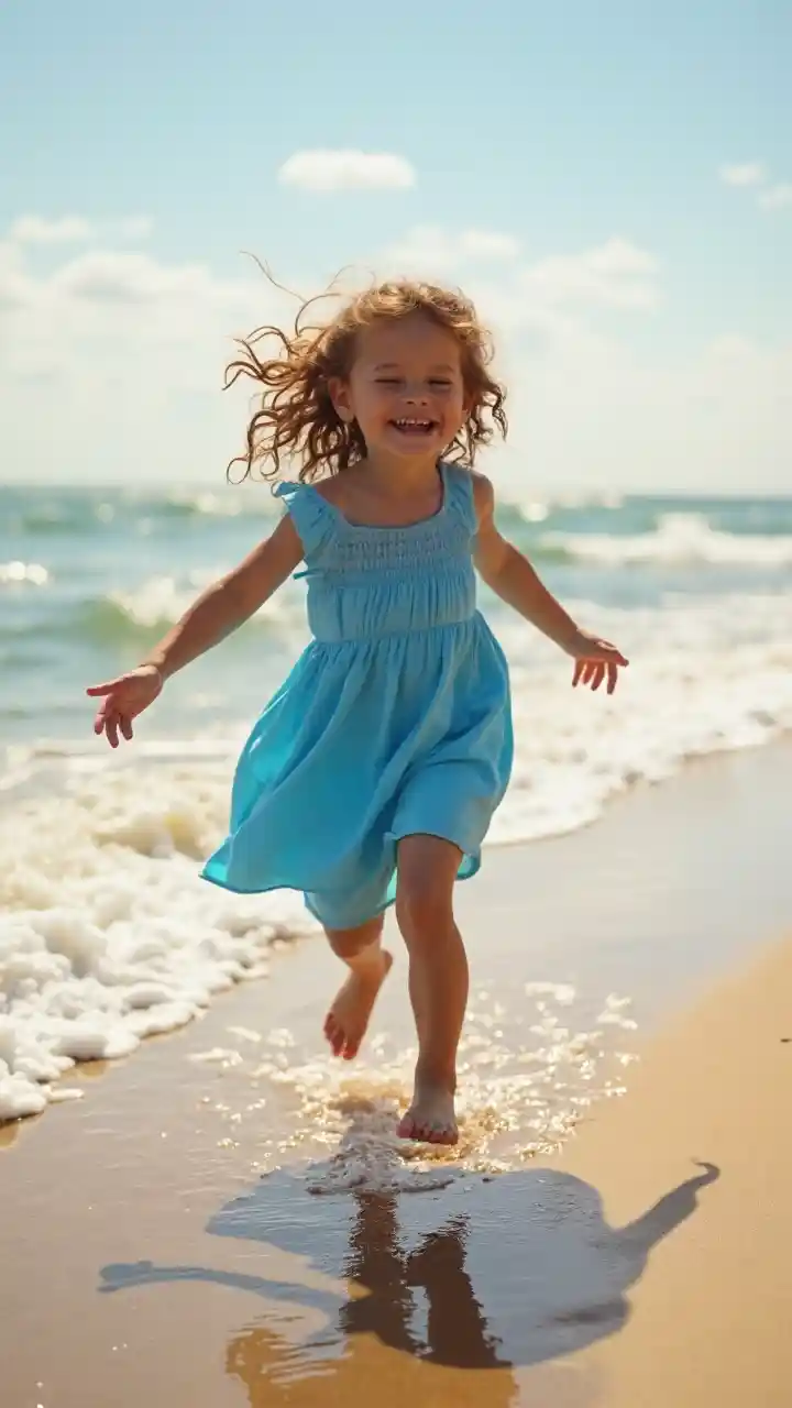 Imagínese a una niña con el pelo rizado, con un vestido de verano azul brillante, corriendo descalza por una playa de arena. La brisa fresca roza su piel mientras las olas rompen en la orilla. Su risa hace eco al aire libre, y sus brazos se extienden como si estuviera volando. El sol proyecta una luz dorada a través de la playa, creando un ambiente cálido y despreocupado, y el momento captura la alegría pura de un niño que experimenta la belleza de la naturaleza.