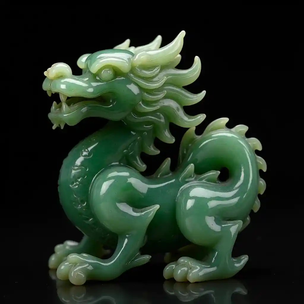 RileyDragón chino celestial de jade brillante bellamente tallado, rostro sabio, jade nefrita tallado a mano, foto de museo, fondo negro